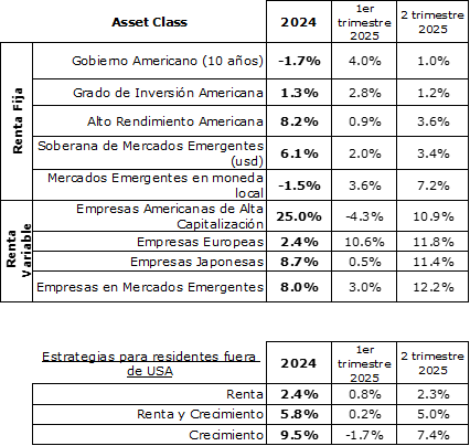 El segundo trimestre de 2025 experimentó rendimientos positivos sólidos en las acciones de EE. UU. y rendimientos de renta fija más modestamente positivos. En lo que va del año, los rendimientos de las clases de activos son ampliamente positivos.