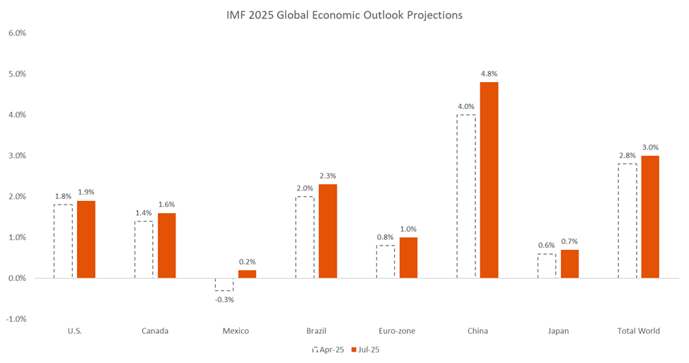 The IMF provided updated global growth forecasts and revised its 2025 global growth projection to 3.0%, an upward revision from the 2.8% forecast in April. The revised outlook reflects front-loading ahead of tariffs, lower effective tariff rates, better financial conditions, and fiscal expansion in some major jurisdictions. The IMF also expects global inflation to fall, and US inflation to stay above target. They maintain their views on downside risks from higher tariffs, elevated uncertainty, and geopolitical tensions.
