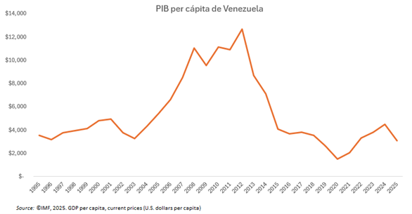 - La transición es bienvenida para los millones de venezolanos que han sufrido una disminución en la calidad de vida o se han visto obligados a abandonar su país en las últimas dos décadas. Observamos que la diáspora venezolana es una de las mayores migraciones en tiempos modernos, con casi 8 millones de venezolanos dejando su país desde 2014. El PIB per cápita en Venezuela ha caído de más de $12,000 en 2012 a alrededor de $3,000 en la actualidad.