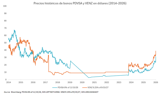 - La acción de EE. UU., aunque inesperada, había sido anticipada desde hace tiempo con el despliegue de tropas y personal militar en la región del Caribe. Como resultado, los bonos soberanos de Venezuela y de PDVSA han repuntado en los últimos meses. Antes de esta acción, las cotizaciones situaban tanto a PDVSA como a los bonos soberanos de Venezuela en el rango de 20-30, después de caer hasta cifras de un solo dígito tras las sanciones impuestas en 2018. Las primeras indicaciones muestran que los bonos soberanos de Venezuela y PDVSA han subido entre 6 y 8 puntos a lo largo de la curva, alcanzando el rango alto de los 30 y bajo de los 40.