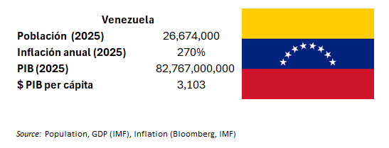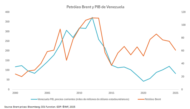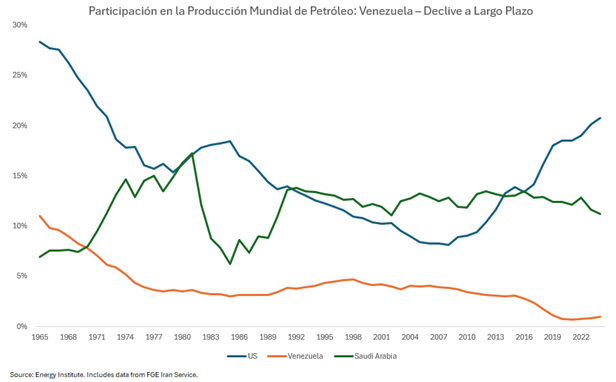 - Destacamos que la economía de Venezuela se redujo bajo Maduro, con caídas significativas en el PIB. La producción económica sigue vinculada al petróleo, pero señalamos que actualmente Venezuela representa solo alrededor del 1 % de la producción diaria mundial.
