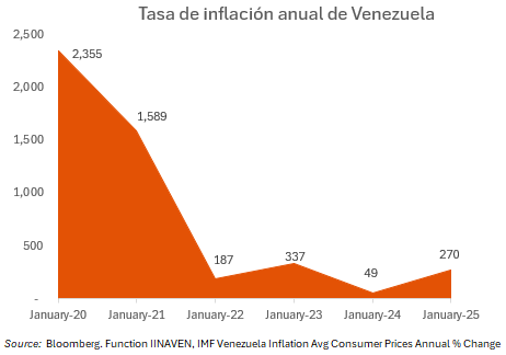 - Venezuela ha soportado hiperinflación en los últimos años. Aunque se ha enfriado un poco, sigue en una tasa anual del 270 %, según estimaciones del FMI. También señalamos que el país no ha publicado estadísticas económicas confiables en varios años. Esto convierte laprevisión económica en mera especulación, considerando la elevada incertidumbre sobre el camino a seguir.