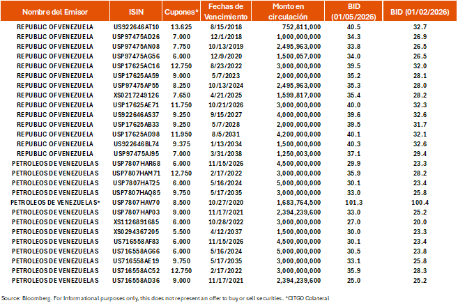 - No mantenemos una recomendación formal para los bonos venezolanos, ya que siguen en estado de incumplimiento. Aun así, esperamos ver optimismo sobre una posible reincorporación de Venezuela a los mercados de capital globales. Algunos participantes del mercado han sugerido un valor de recuperación en el rango de 50-60 centavos.