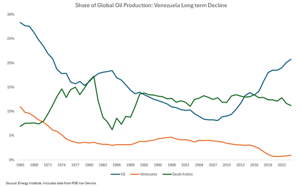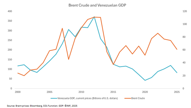 - We highlight that Venezuela’s economy shrunk under Maduro, with material declines in GDP. The economy’s output remains tied to oil, but we note that currently Venezuela represents only about 1% of global daily production.