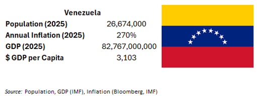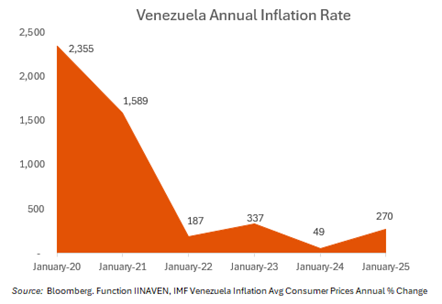 - Venezuela has endured hyperinflation in recent years. Although it has cooled somewhat, it remains at a 270% annual rate, per IMF estimates. We also note the country has not published reliable economic statistics in several years. This makes economic forecasting mere guesswork considering the elevated uncertainty over the path forward.