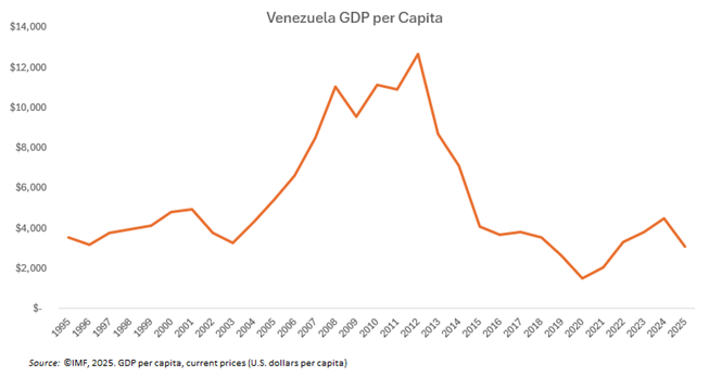 - The transition is welcome for the millions of Venezuelan people who have suffered from a declining quality-of-life or been forced to leave their country in the past two decades. We note that the Venezuelan diaspora is one of the largest out-migrations in modern times, with nearly 8 million Venezuelan people leaving their country since 2014. GDP per capita in Venezuela has fallen from over $12,000 in 2012 to around $3,000 today.