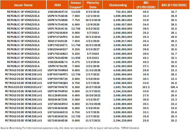 - We do not maintain a formal recommendation for Venezuelan bonds, as they remain in default. Still, we expect to see optimism about possible re-entry of Venezuela into the global capital markets. Some market participants have called for a recovery value in the 50-60 cents range.