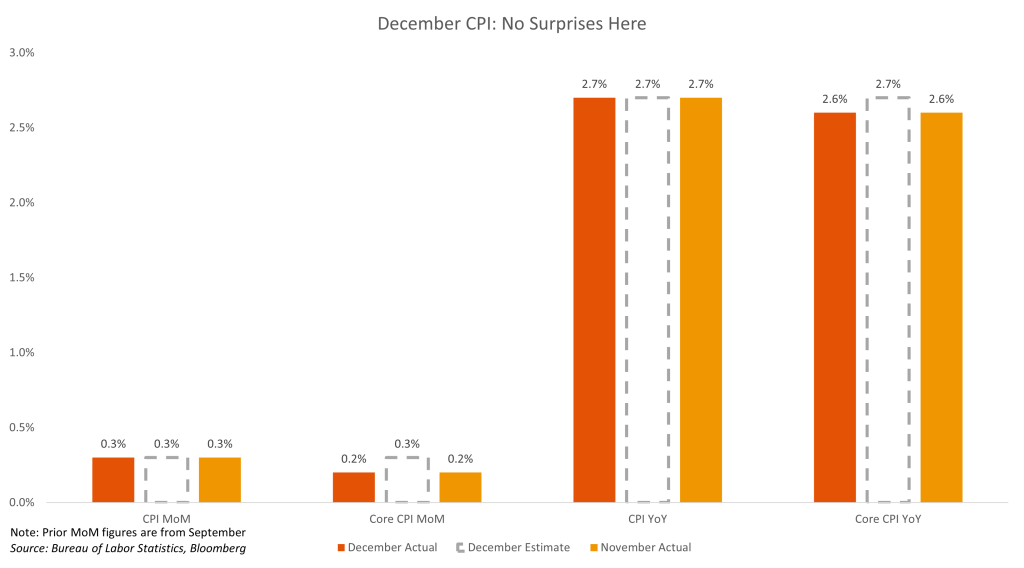 - Macro data from last week included December CPI, which showed that inflation remains stable, but above the Fed’s target. Core CPI was 2.6% YoY, and 0.2% MoM, both of which were slightly better expected.