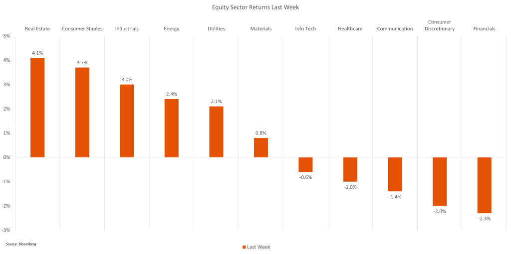 - In markets, U.S. stocks declined last week, with the exception of small caps. We continue to see a broadening and rotation trade with info tech and communications down last week. Financials also declined following the President’s plans to introduce a rate cap on credit cards, and despite relatively solid earnings from the big banks which have reported so far.