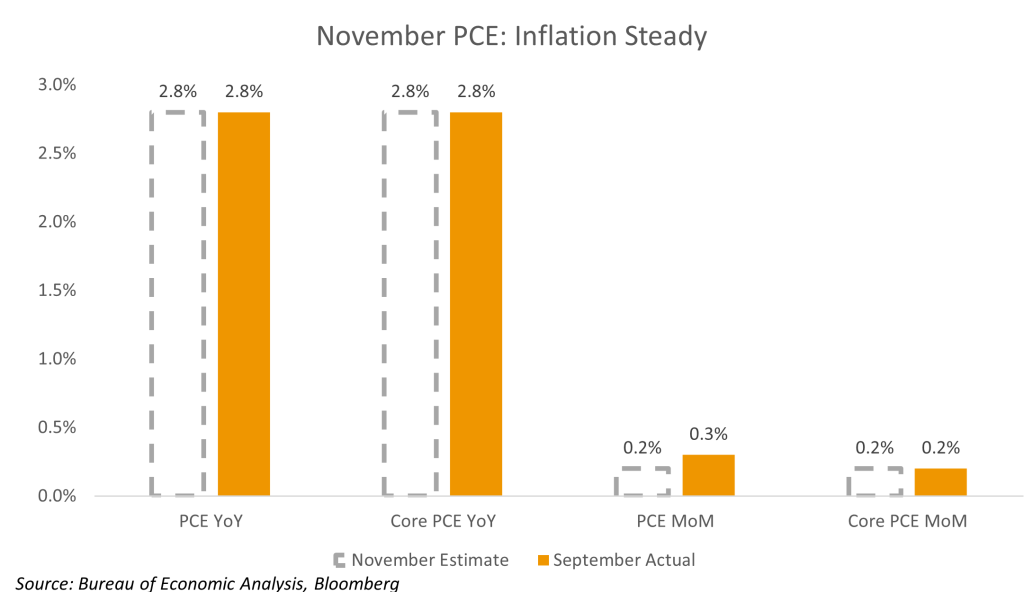 - The catch-up in macroeconomic data from the government shutdown continues. This week, we get PCE data from November. PCE YoY is expected to increase by 2.8% on both a headline and on a core basis. PCE MoM is expected to increase by 0.2% on both a headline and on a core basis.