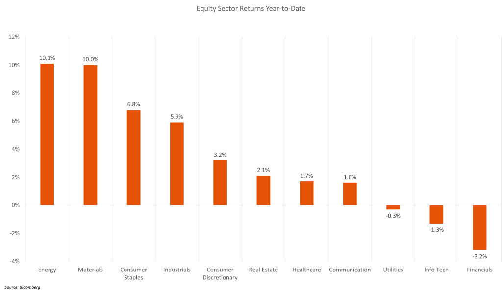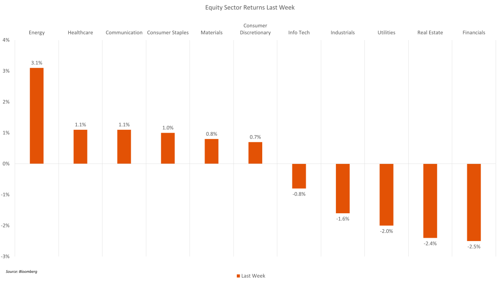 • In U.S. equities, energy is the best performing sector, while Financials are the laggard or both last week and the year-to-date.