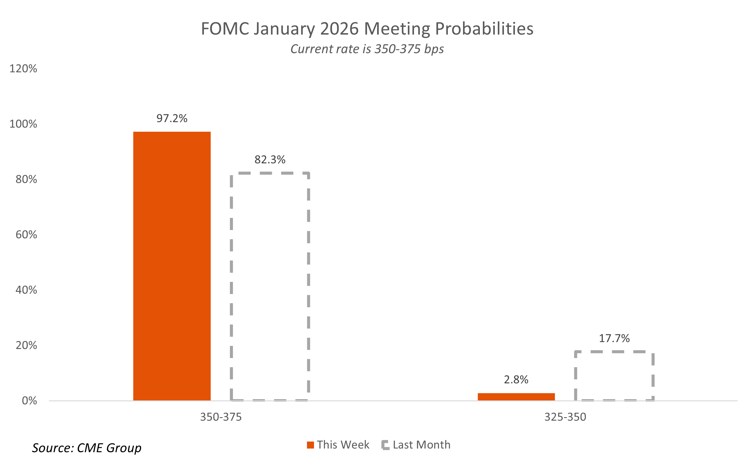 • On Wednesday, the FOMC holds its first meeting of 2026 with the Fed expected to hold rates at 350-375 bps. In fixed income markets, a bond sell-off in Japan is pressuring the long-end in the U.S., while the short-end remains steady on hopes for additional rate cuts later this year. The press conference from Fed Chair Powell is likely to include questions about the pending DoJ investigation, as well as commentary about the pace of future rate cuts.