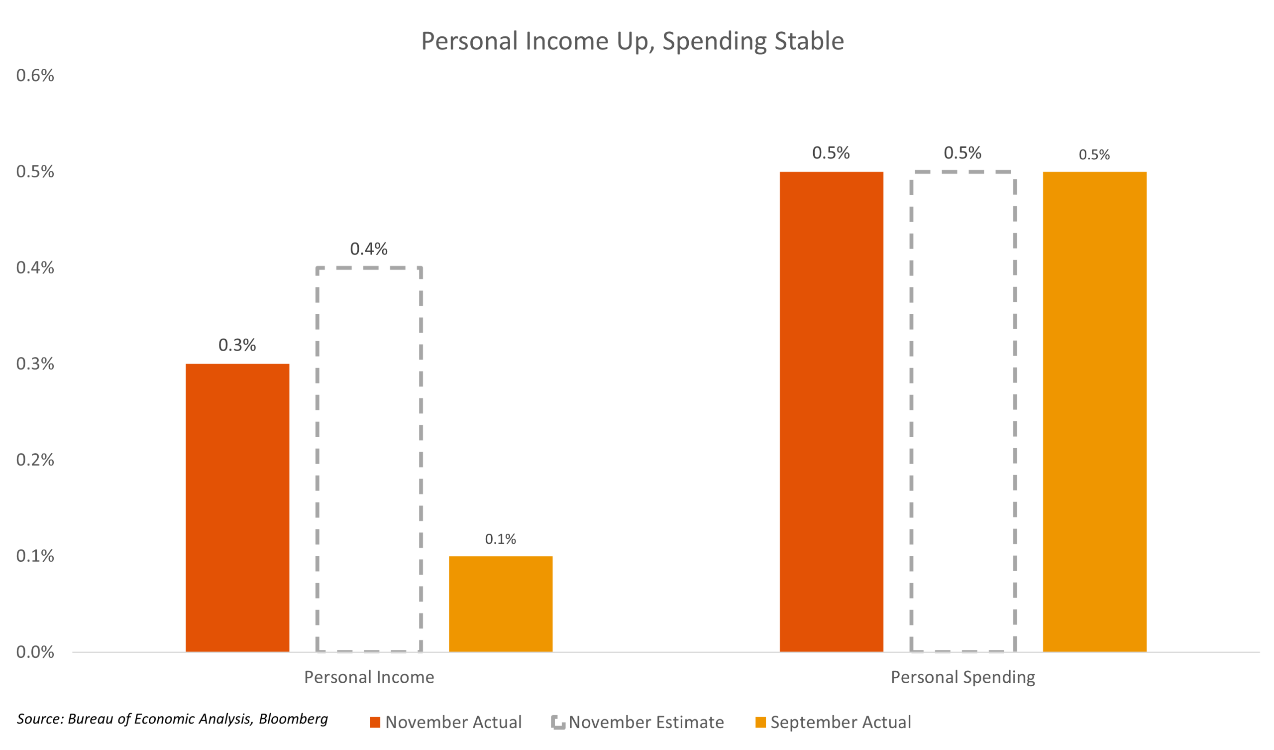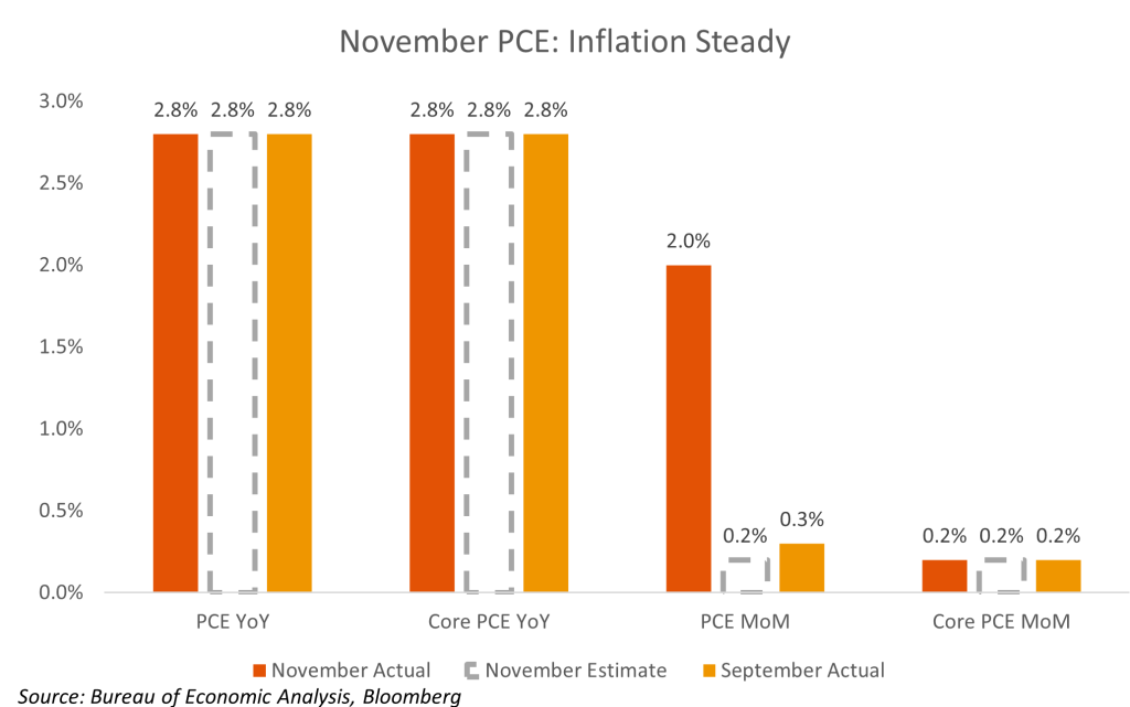 • Macro data from last week included PCE data from November, which came in-line with estimates. PCE YoY rose by 2.8% on both a headline and on a core basis, while PCE MoM climbed by 0.2% on both a headline and on a core basis. Personal Income and Spending from November showed stable Income and higher Spending.
