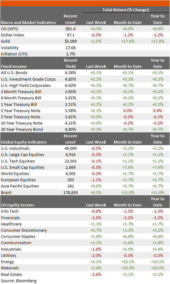 • Last week’s Davos forum ended with de-escalation from the U.S. regarding Greenland, with President Trump announcing a framework for U.S. interests in with NATO leader Rutte. Markets took the resolution positively and equities posted small losses for the week, recouping larger losses from Tuesday with a late week rally. Geopolitical uncertainty is driving a rally in safe haven assets such as gold, which is up 18% in the first few weeks of the year and now above $5,000. Meanwhile, the U.S. dollar continues to slide.