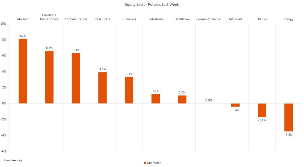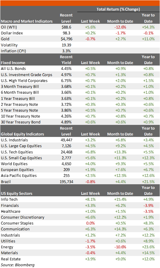 - Markets rallied strongly last week, with major equity indexes setting new all-time highs on news of a ceasefire in the Middle East and re-opening of the Strait of Hormuz. Oil-sensitive sectors saw major moves following a drop in oil prices, as cruise companies and airlines jumped, while energy producers sold off. Treasuries also rallied last week, as lower oil prices drove hopes that inflation could be contained and allow the Fed to lower interest rates later this year, helping drive the U.S. Treasury yield curve lower and credit spreads tighter.