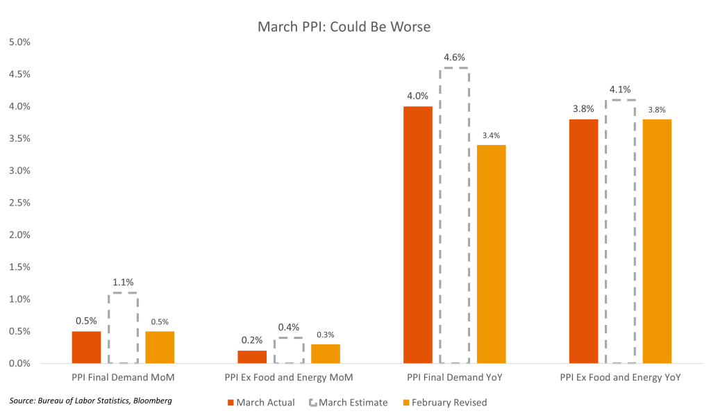 - In macro news last week, we got the March PPI report. The data showed that prices rose both YoY and MoM, but by less than estimated. February PPI was also revised downward. PPI Final Demand for March rose by 0.5% MoM, vs. estimate of 1.1%, and by 4.0% YoY, compared to the estimate of 4.6%. Excluding Food and Energy, PPI for March rose 0.2% MoM and 3.8% YoY. PPI is a leading indicator for CPI and likely foreshadows further pressure on CPI in the months ahead.