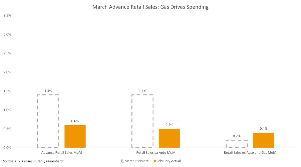 - In macro data this week, we get Advance Retail Sales for March, which are expected to climb by 1.4% MoM compared to 0.6% for February. However, Advance Retail sales excluding the volatile Auto and Gas categories is expected to rise by only 0.2% MoM, compared to 0.4% in February. This data shows the impact of higher gas prices on consumer spending, with the overall figure higher, but the core figure falling, as a greater proportion of the consumer wallet is directed toward gas.