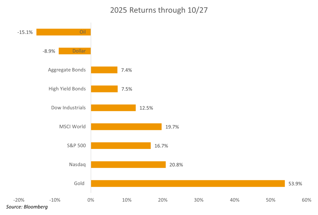 - Third quarter earnings season continues this week with earnings from five of the Mag 7 including Alphabet (GOOGL), Microsoft (MSFT), Amazon (AMZN), Apple (AAPL), and Meta (META). Other companies set to repot include ServiceNow (NOW), United Health (UNH), United Parcel Services (UPS), Booking.com (BKNG), Visa (V), Mastercard (MA), Boeing (BA), Corning (GLW), PayPal (PYPL), Caterpillar (CAT), Starbucks (SBUX), Bristol-Myers (BMY), Altria (MO) and Arista Networks (ANET).