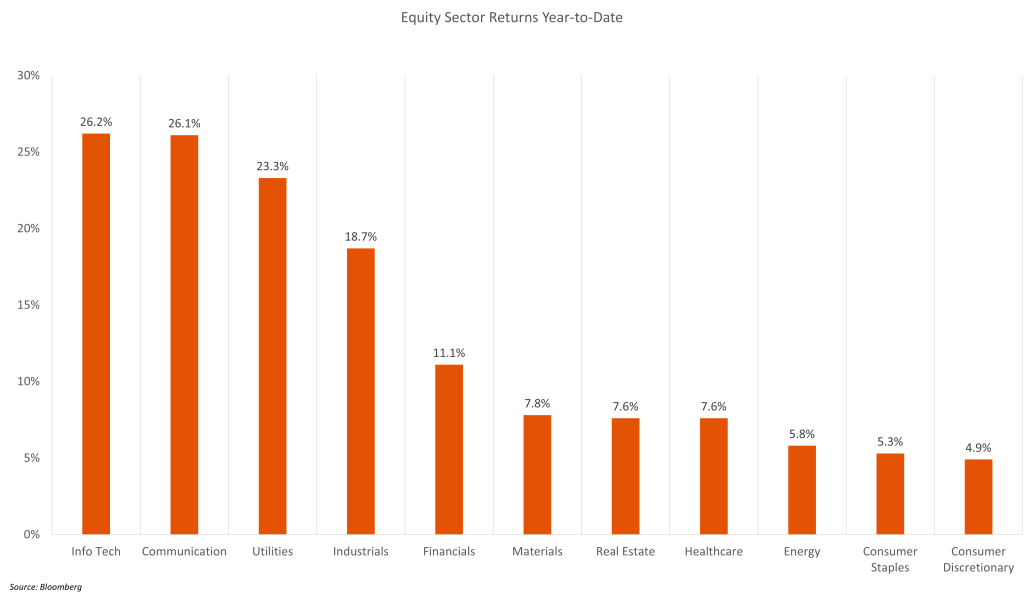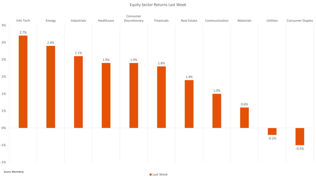 - Equities rose last week, reaching new all-time highs on hopes of a truce with China as well as healthy earnings results. As well, Treasury yields fell in advance of expectations for a rate cut at the FOMC this week, providing further support for equities.