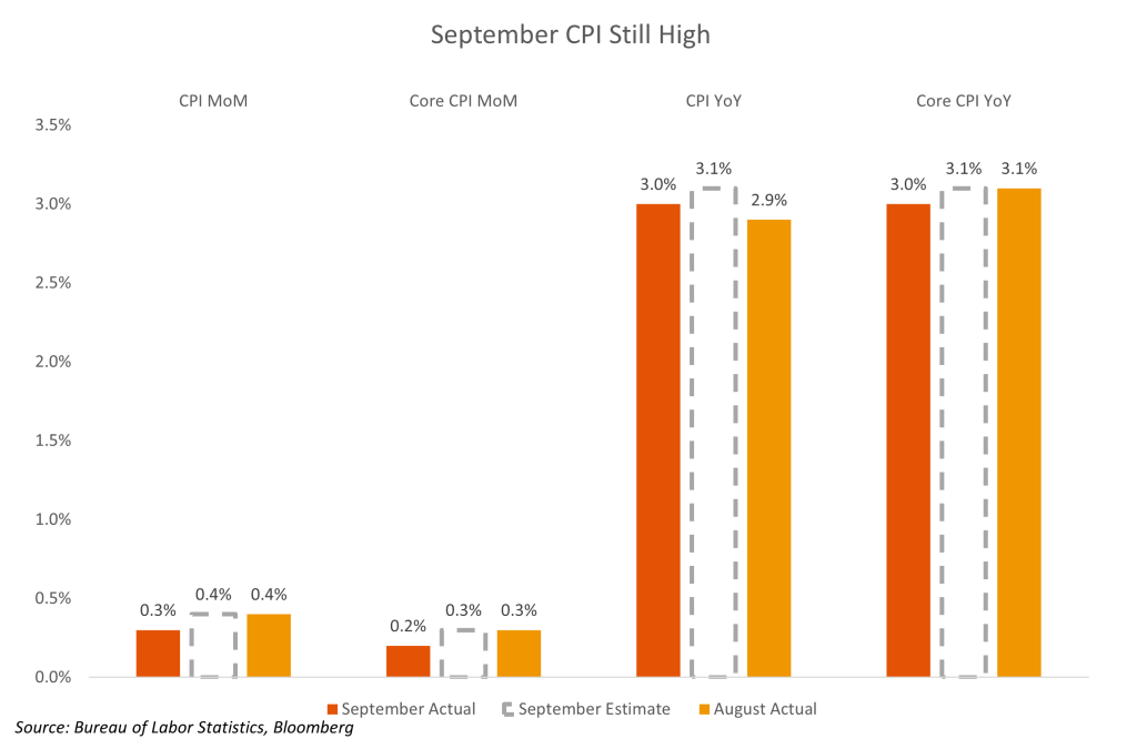 - The Fed is poised to cut interest rates by -25 bps this week to a range of 375-400 bps. The rate cut is widely expected even as inflation remains above target. In one of the few pieces off recent macro data, CPI rose by 0.3% MoM and 3.0% YoY on a headline basis for September, both of which were 0.1% better than expected. Core CPI climbed by 0.2% MoM and 3.0% YoY. We note that a large portion of the calculation (~40%) for CPI was based on estimates, and therefore the data quality may be lower than usual.
