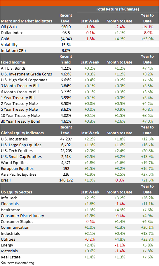 Financial Markets – Recent Prices and Yields, and Weekly, Monthly, and YTD (Table): Bloomberg, Weekly Market Data is in USD and refers to the following indices: Macro & Market Indicators: Volatility (VIX); Oil (WTI); Dollar Index (DXA); Inflation (CPI YoY); Fixed Income: All U.S. Bonds (Bloomberg Aggregate Index); Investment Grade Corporates (Bloomberg US Corporate Index); US High Yield (Bloomberg High Yield Index), Treasuries (ICE BofA Treasury Indices); Equities: U.S. Industrials (Dow Jones Industrial Average); U.S. Large Caps (S&P 500); U.S Tech Equities (Nasdaq Composite); European (MSCI Euope), Asia Pacific (MSCI AP), and Latin America Equities (MSCI LA); Sectors (S&P 500 GICS Sectors) Source: Bloomberg. Fed Funds Rate probabilities, Source: CME FedWatch Tool.