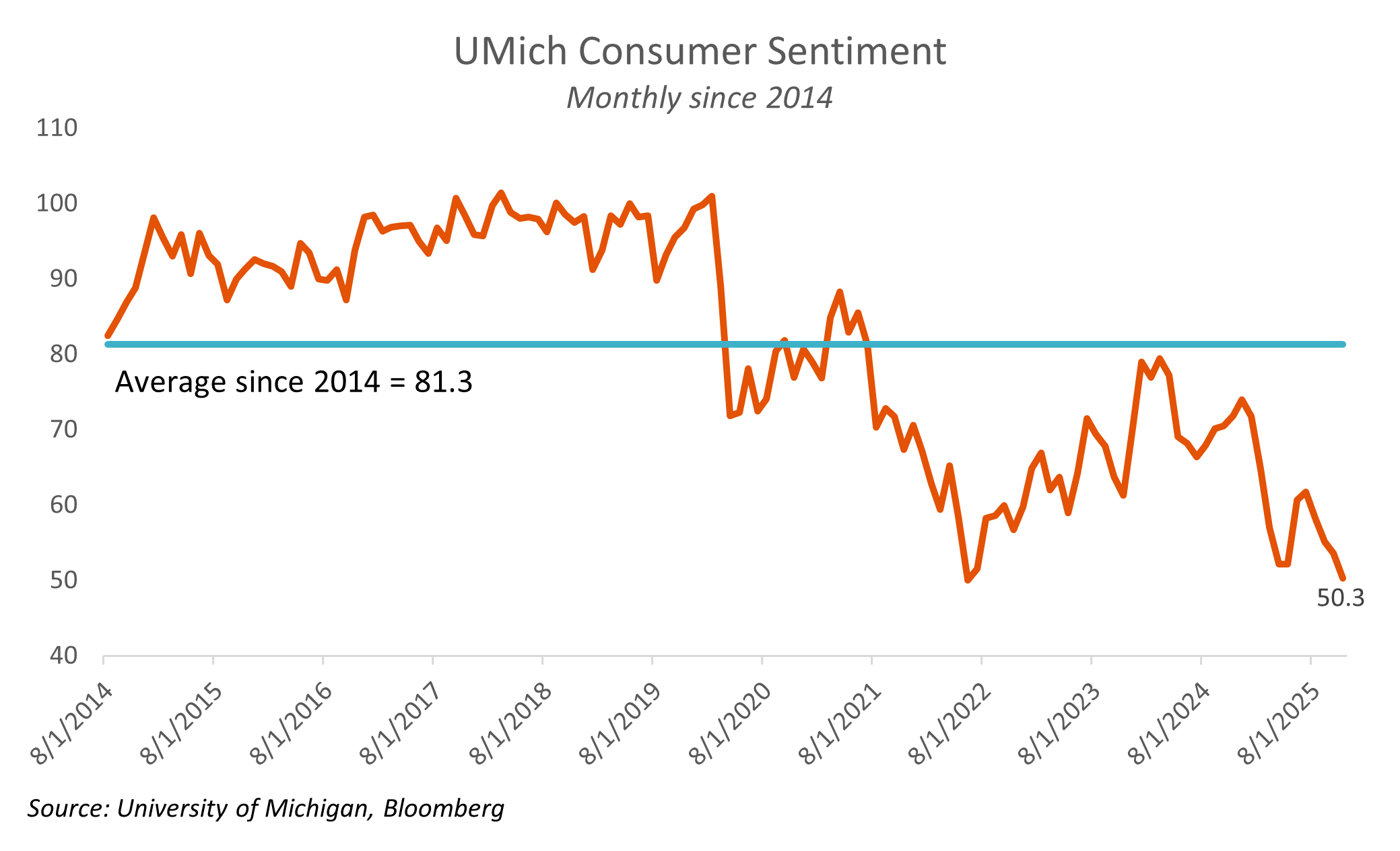 - On the flip side, University of Michigan consumer sentiment was lower than expected at 50.3 vs. estimate of 53.0 and prior of 53.6. One year inflation expectations rose to 4.7% from 4.6% prior.