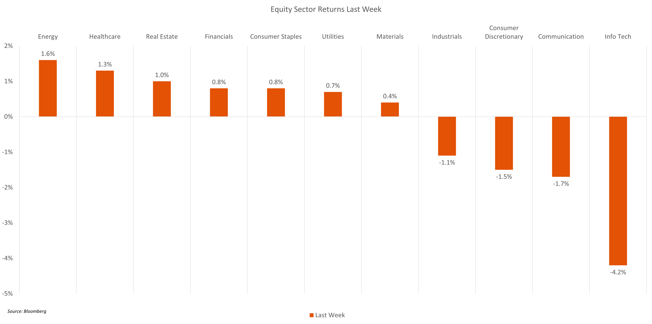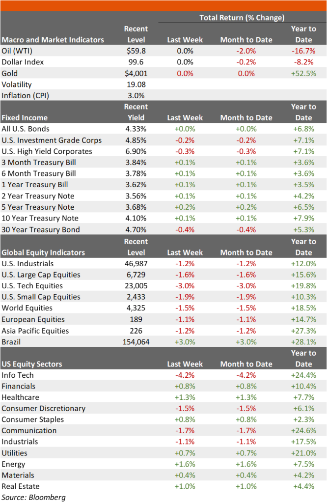 - Equities sold off last week as concerns mounted that equity multiples are too aggressive and unjustified based on reality versus hopes, while the ongoing government shutdown also contributed to the downbeat mood. As well, several tech and AI-related stocks released 3Q25 earnings results that felt modest amidst high hopes of additional growth to justify elevated stock prices.