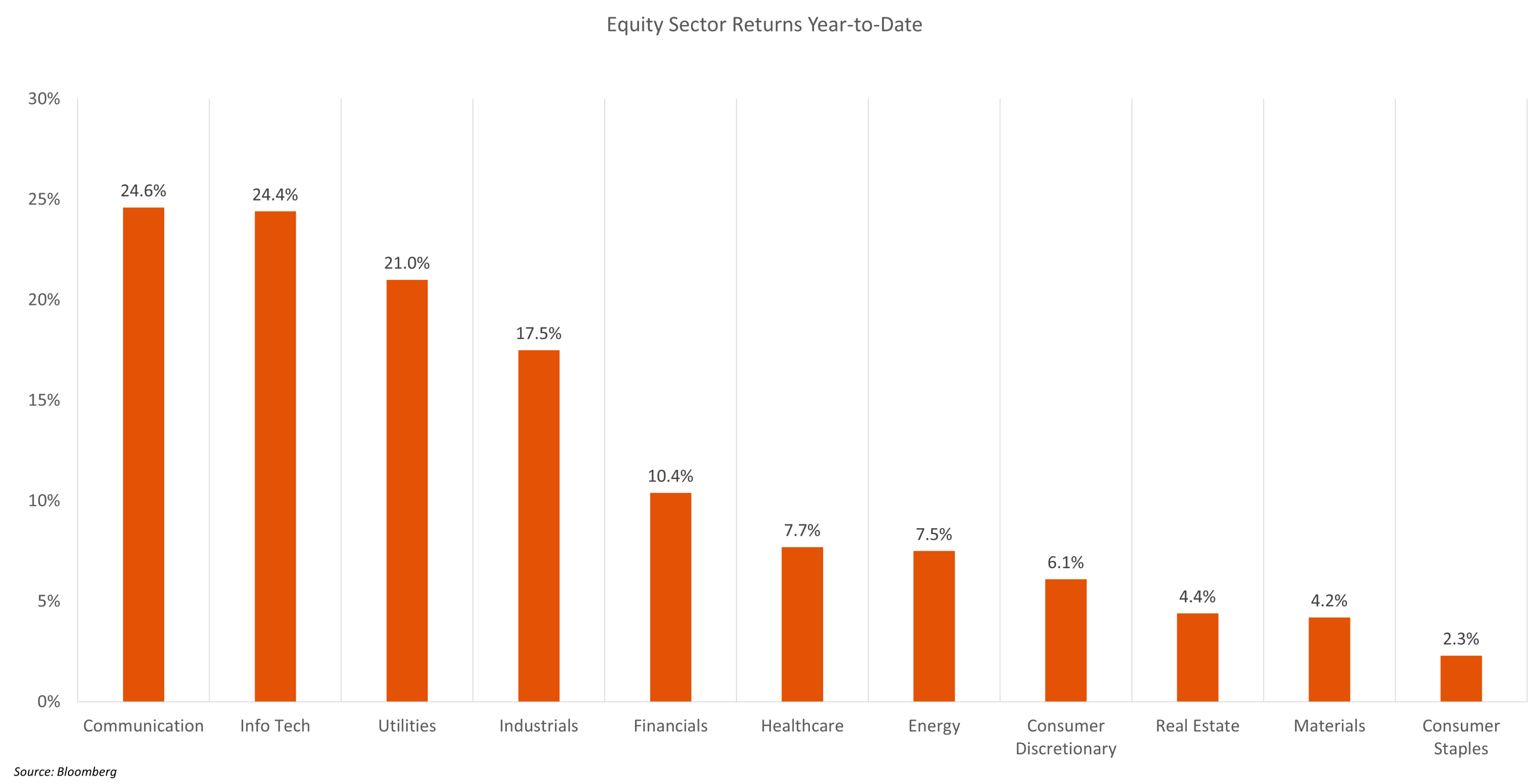 Financial Markets – Recent Prices and Yields, and Weekly, Monthly, and YTD (Table): Bloomberg, Weekly Market Data is in USD and refers to the following indices: Macro & Market Indicators: Volatility (VIX); Oil (WTI); Dollar Index (DXA); Inflation (CPI YoY); Fixed Income: All U.S. Bonds (Bloomberg Aggregate Index); Investment Grade Corporates (Bloomberg US Corporate Index); US High Yield (Bloomberg High Yield Index), Treasuries (ICE BofA Treasury Indices); Equities: U.S. Industrials (Dow Jones Industrial Average); U.S. Large Caps (S&P 500); U.S Tech Equities (Nasdaq Composite); European (MSCI Euope), Asia Pacific (MSCI AP), and Latin America Equities (MSCI LA); Sectors (S&P 500 GICS Sectors) Source: Bloomberg. Fed Funds Rate probabilities, Source: CME FedWatch Tool.