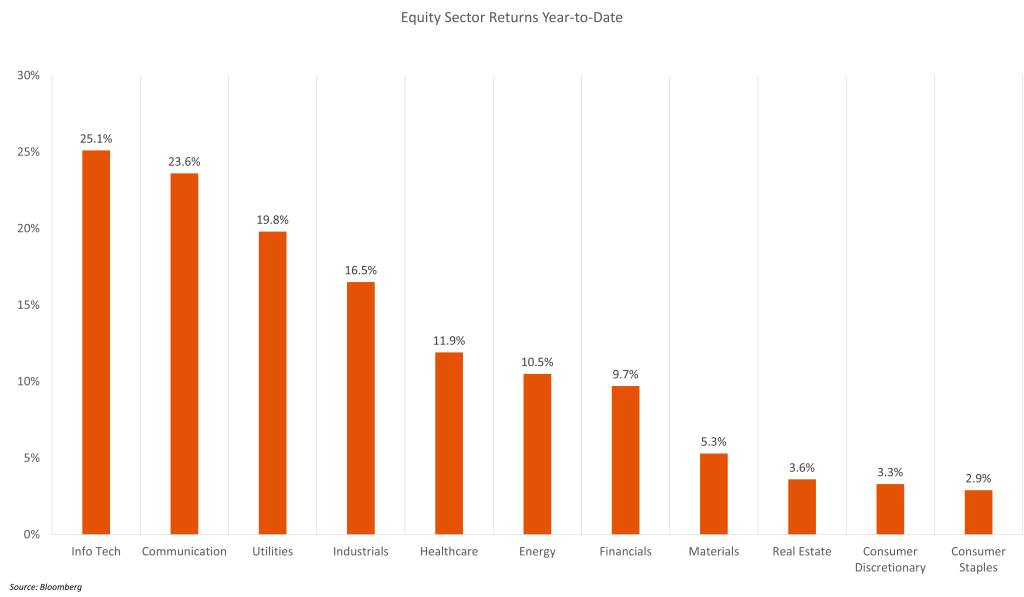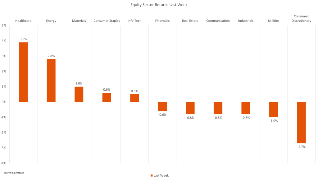 Equities declined last week, as an agreement to end the longest government shutdown on record was not enough to fend off investor concern for AI valuations. Even though the government shutdown was finally resolved, the market mood seemed to shift to a more cautious tone as more investors declared AI-related tech valuations are unsustainable. The concerns were evident in equity sector returns with defensive sectors such as Healthcare rallying, while Consumer Discretionary and Communication declined. The Nasdaq fell, while the Dow was higher on the week.