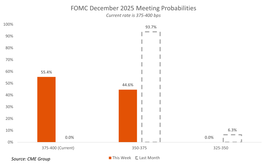 - Also adding to the market’s nerves were comments from several Fed officials pushing back on expectations for a December rate cut. Futures are now pricing in a better-than-even chance of a hold at the next meeting after a near-lock on a 25 bps cut just one month ago.