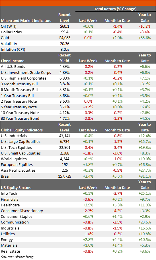 Financial Markets – Recent Prices and Yields, and Weekly, Monthly, and YTD (Table): Bloomberg, Weekly Market Data is in USD and refers to the following indices: Macro & Market Indicators: Volatility (VIX); Oil (WTI); Dollar Index (DXA); Inflation (CPI YoY); Fixed Income: All U.S. Bonds (Bloomberg Aggregate Index); Investment Grade Corporates (Bloomberg US Corporate Index); US High Yield (Bloomberg High Yield Index), Treasuries (ICE BofA Treasury Indices); Equities: U.S. Industrials (Dow Jones Industrial Average); U.S. Large Caps (S&P 500); U.S Tech Equities (Nasdaq Composite); European (MSCI Euope), Asia Pacific (MSCI AP), and Latin America Equities (MSCI LA); Sectors (S&P 500 GICS Sectors) Source: Bloomberg. Fed Funds Rate probabilities, Source: CME FedWatch Tool.