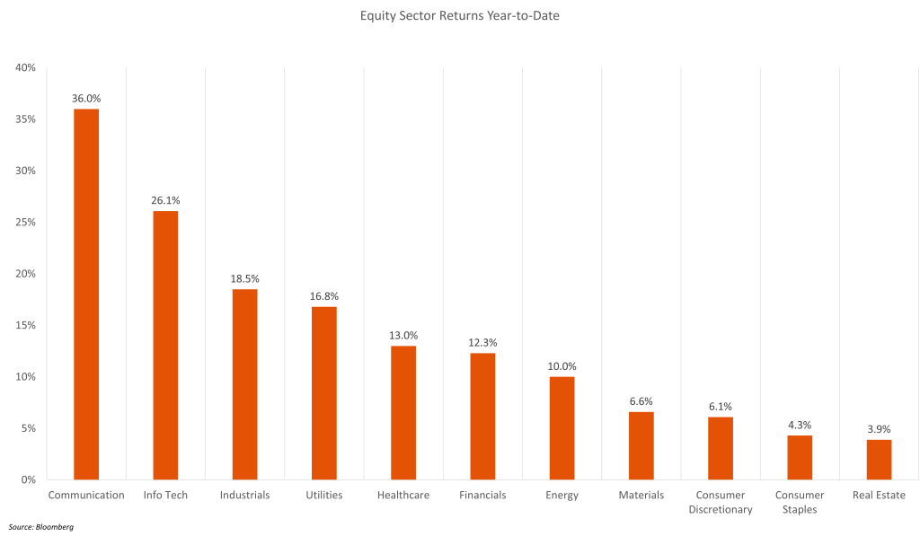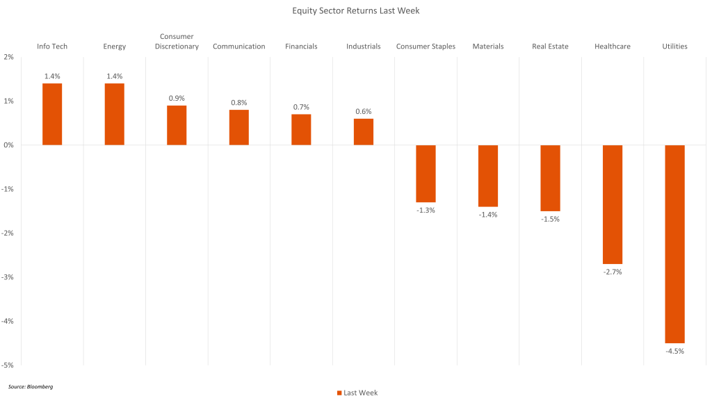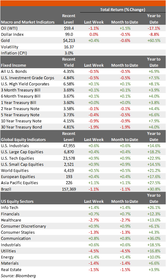 Financial Markets – Recent Prices and Yields, and Weekly, Monthly, and YTD (Table): Bloomberg, Weekly Market Data is in USD and refers to the following indices: Macro & Market Indicators: Volatility (VIX); Oil (WTI); Dollar Index (DXA); Inflation (CPI YoY); Fixed Income: All U.S. Bonds (Bloomberg Aggregate Index); Investment Grade Corporates (Bloomberg US Corporate Index); US High Yield (Bloomberg High Yield Index), Treasuries (ICE BofA Treasury Indices); Equities: U.S. Industrials (Dow Jones Industrial Average); U.S. Large Caps (S&P 500); U.S Tech Equities (Nasdaq Composite); European (MSCI Euope), Asia Pacific (MSCI AP), and Latin America Equities (MSCI LA); Sectors (S&P 500 GICS Sectors) Source: Bloomberg. Fed Funds Rate probabilities, Source: CME FedWatch Tool.
