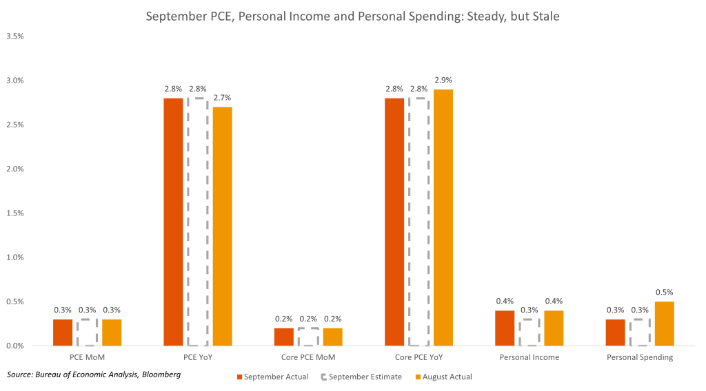 - September PCE came in as expected, with both headline and core PCE up 2.8% YoY. We note that this is materially higher than the Fed’s 2% target, but markets took the steady numbers as a comfort that inflation does not appear to be getting worse. On a MoM basis, headline PCE rose by 0.3% and core was up 0.2%, both in-line with consensus. We note that the data was from September and represents a lag from the government shutdown. Personal Income and Spending for September were also broadly in-line expectations.