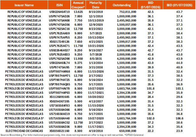 Last week’s AM Call included Amerant’s first take on situation in Venezuela. In our report, we highlighted the broad rebound in market prices for Venezuelan debt instruments: https://www.amerantbank.com/ofinterest/theamcall-01052026/ and https://www.amerantbank.com/ofinterest/es/theamcall-01052026/