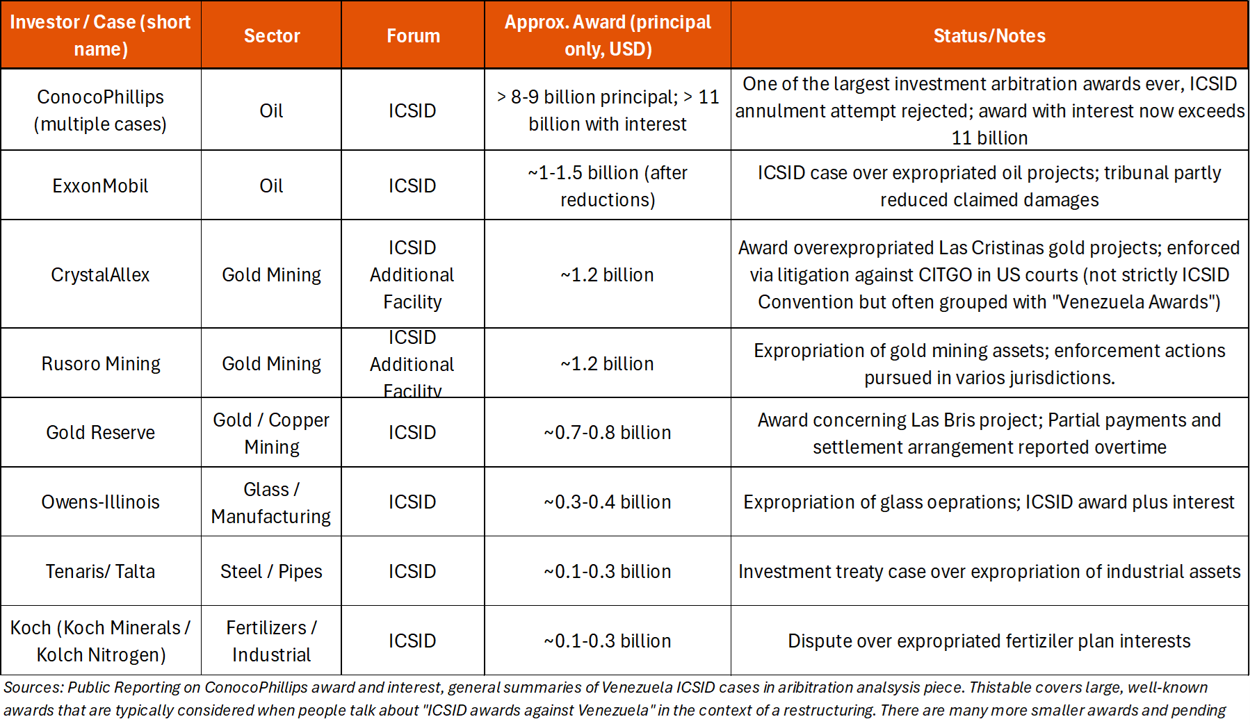 The last one is often overlooked, but is important to understand Venezuela’s debt and legal landscape. The ICSID is part of World Bank Group, and the claimants here matter as much as the bonds in any future restructuring. In past years, Venezuela nationalized dozens of foreign companies (oil, mining, telecoms, banking). As a result, many corporates and investors sued under bilateral investment treaties. Venezuela lost many of these cases. As a result, Venezuela now has one of the largest ICSID liabilities in the world.[2]