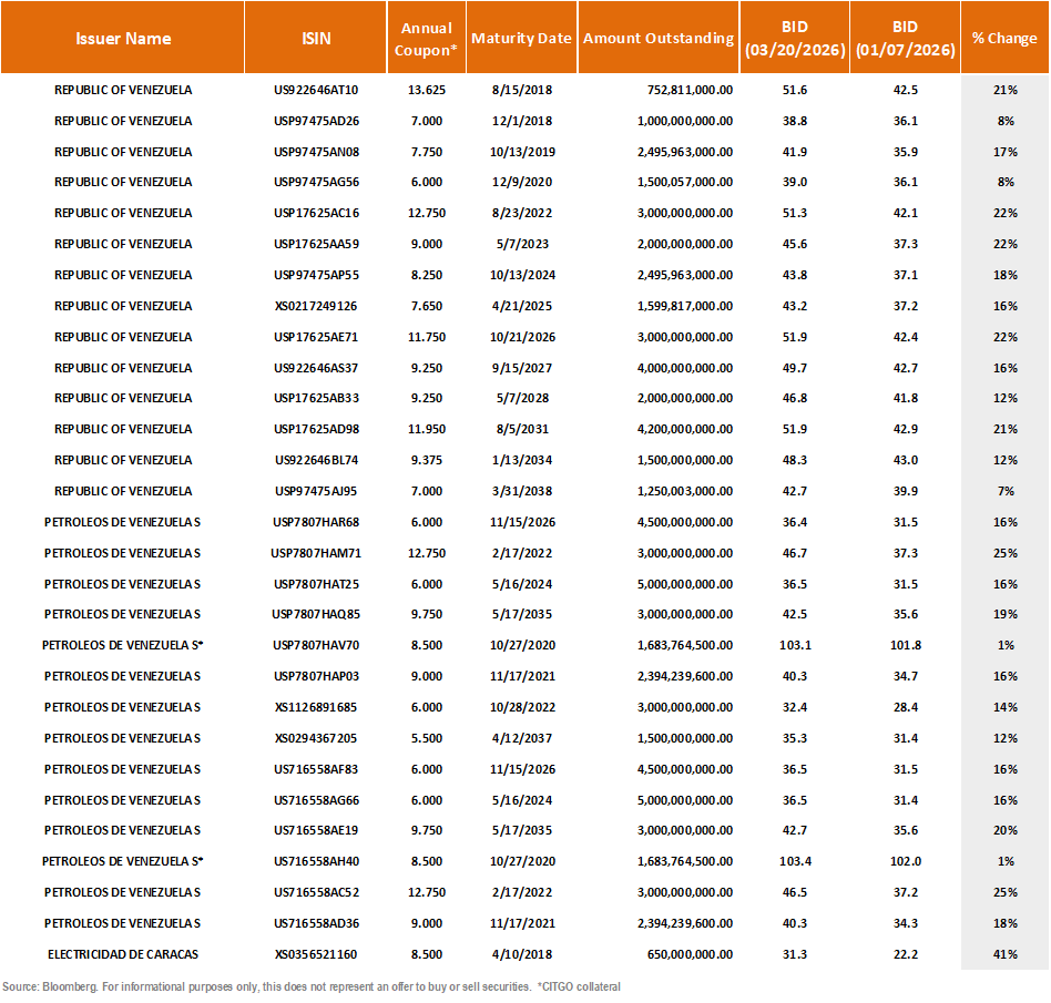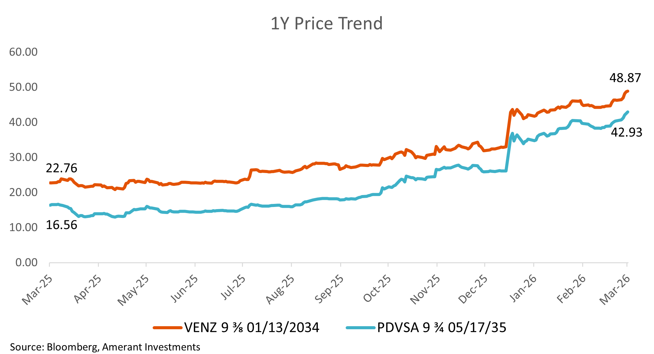 - Higher oil prices, which have risen following the war in Iran, should be positive for debt recovery values in Venezuela